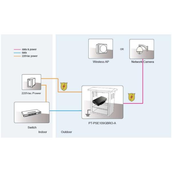 Enclosed in an IP20 high-impact metal case, designed for indoor use but can work outdoor by covered with waterproof case. It works with a wide input voltage of 100-240VAC with 6KV surge protection, 50 or 60 Hz and operates under -40℃ to +65℃. The effective distance limitation is 100 meters over Cat5e/Cat6 cables.